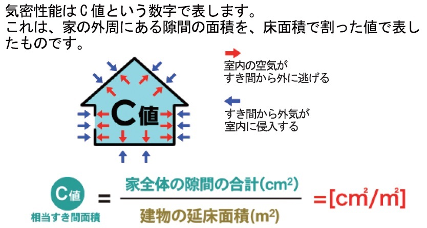 気密性は一般的にC値で表され、高気密住宅とはC値2㎠/㎡程度の住宅のことを言います。